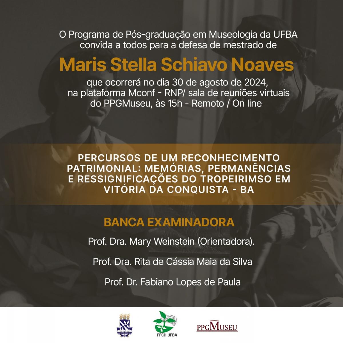 O PPGMUSEU convida a todos(as) para participarem da defesa de mestrado da discente MARIS STELLA SCHIAVO NOVAES. A defesa de Mestrado será realizada no dia 30 de agosto de 2024, às 15:00 horas.