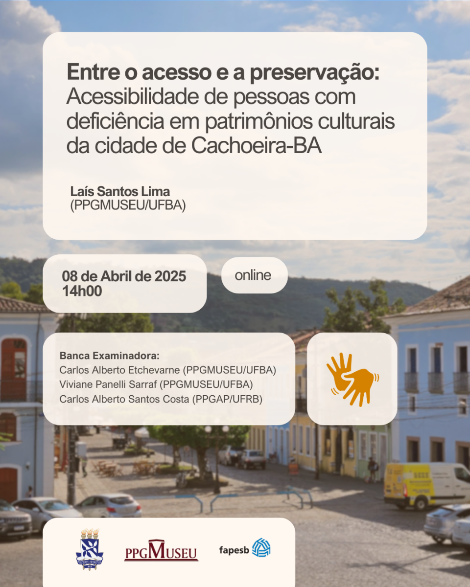 O Programa de Pós-graduação em Museologia tem a satisfação de convidá-los para assistirem a defesa pública da Dissertação de Mestrado da discente LAÍS SANTOS LIMA, que será realizada terça-feira, 08 de abril de 2025, às 14h, via videoconferência RNP, na Universidade Federal da Bahia.